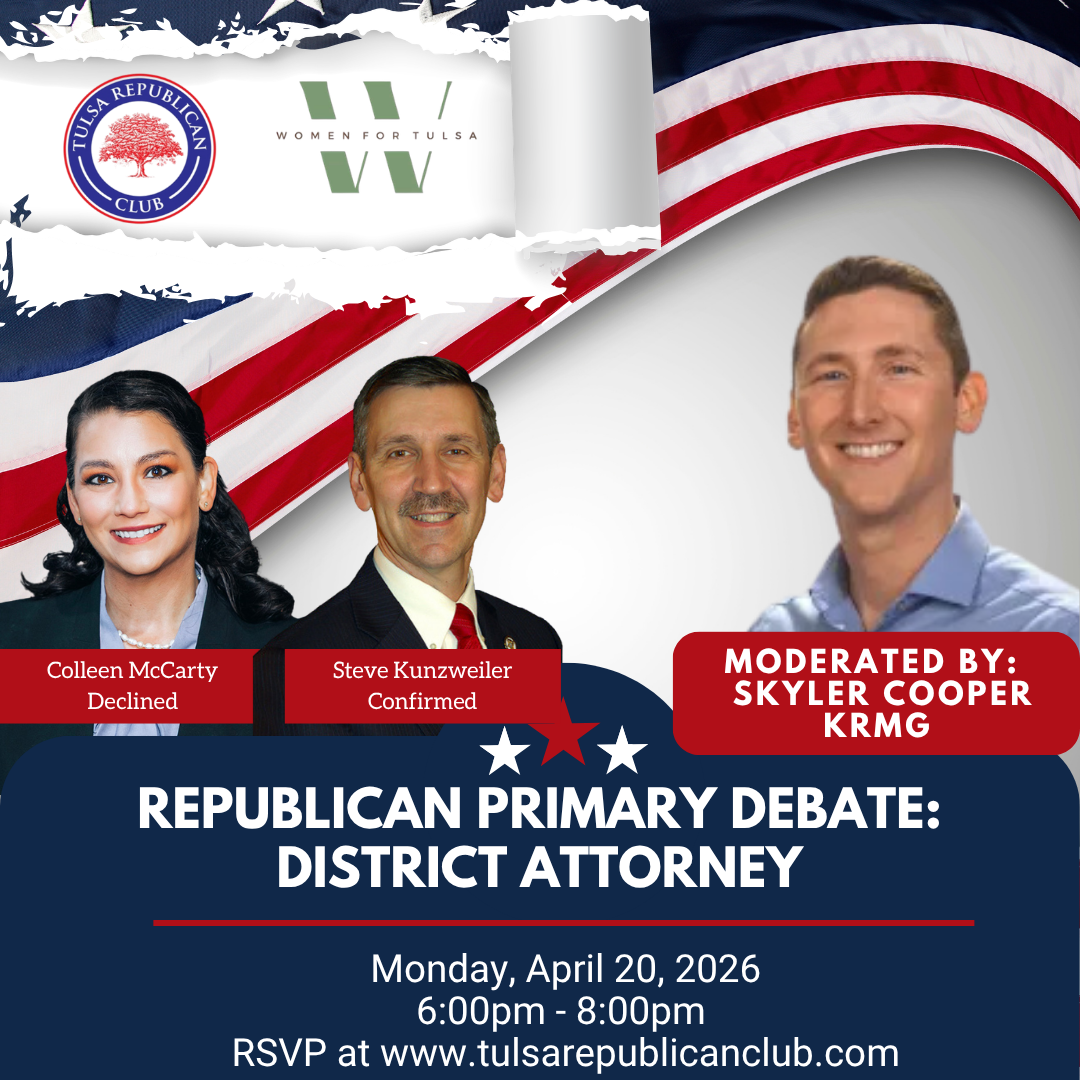 Tulsa, Oklahoma (April 15, 2026) — The Tulsa Republican Club and Women for Tulsa Republican Primary Debate for Tulsa County District Attorney will continue as scheduled on Monday evening, despite challenger Colleen McCarty declining to participate.